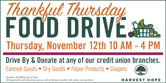 Greenville, SC – Greenville Federal Credit Union will host a community food drive on Thursday, November 12.  All items collected on “Thankful Thursday” will be donated to the local branch of Harvest Hope, South Carolina’s largest food bank, providing over 50,000 meals a week to neighbors in need across the state.